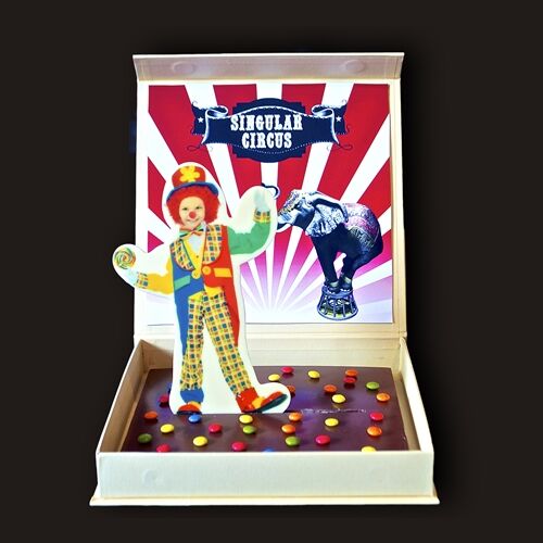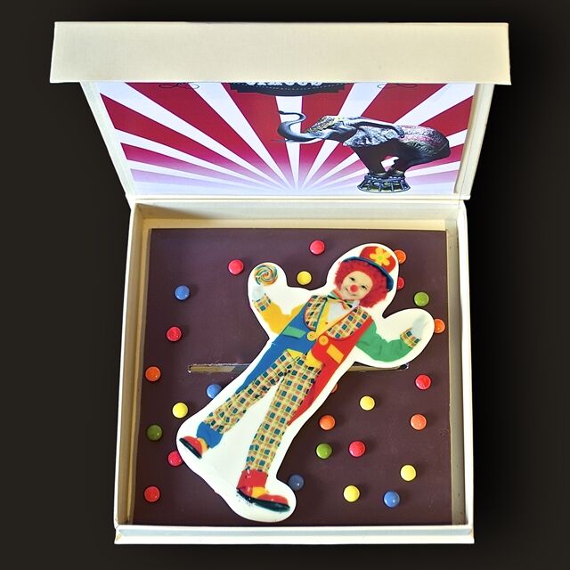Las Figuras de Chocolate Modelo Payaso de RegaloChocolate van presentadas en una elegante caja con una imagen de un impresionante circo clásico. La caja podrás conservarla y utilizarla como recuerdo de este regalo tan singular.