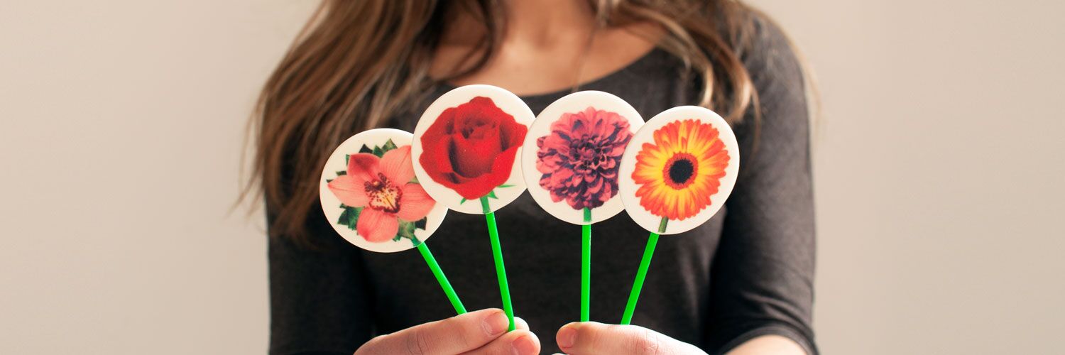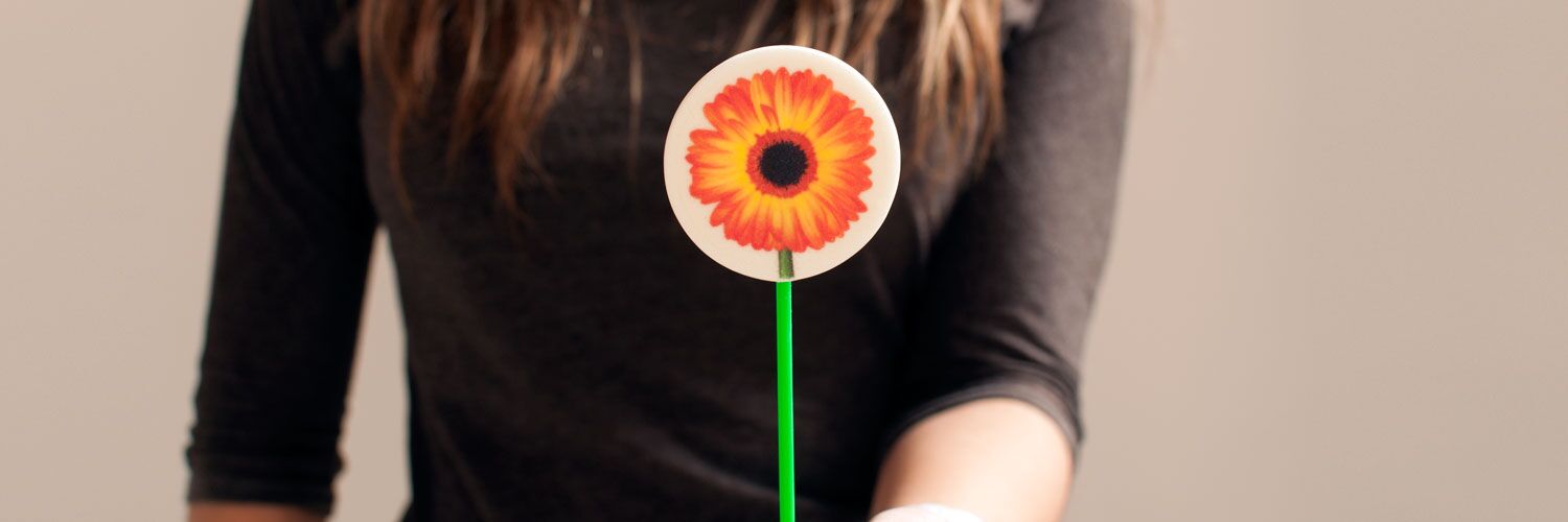 Las flores de caramelo están presentadas en forma de piruletas de elaboradas artesanalmente con azúcar glasé natural. Un capricho que se deshace suavemente en la boca brindándote una dulce sorpresa al paladar.